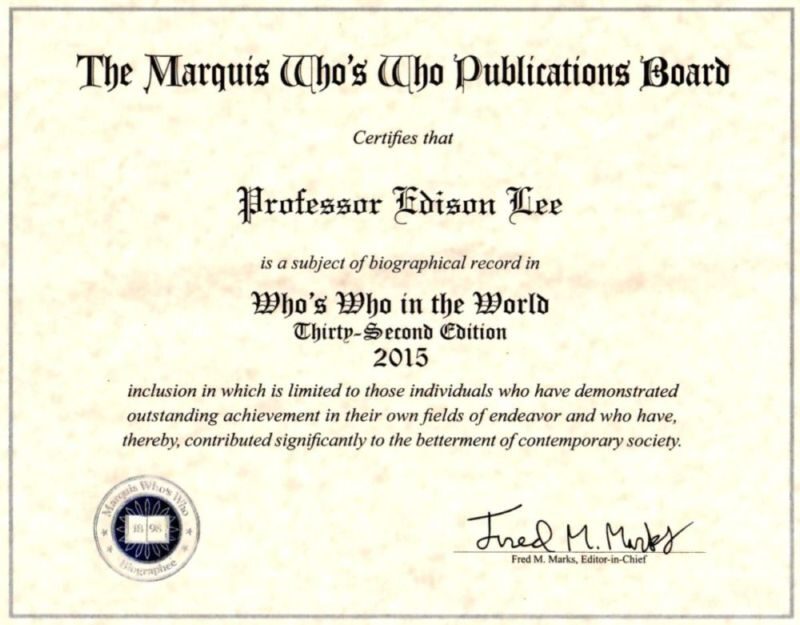 Professor Edison LEE has been published again after 1998, in Marquis “Who’s Who in the World ” 2015.